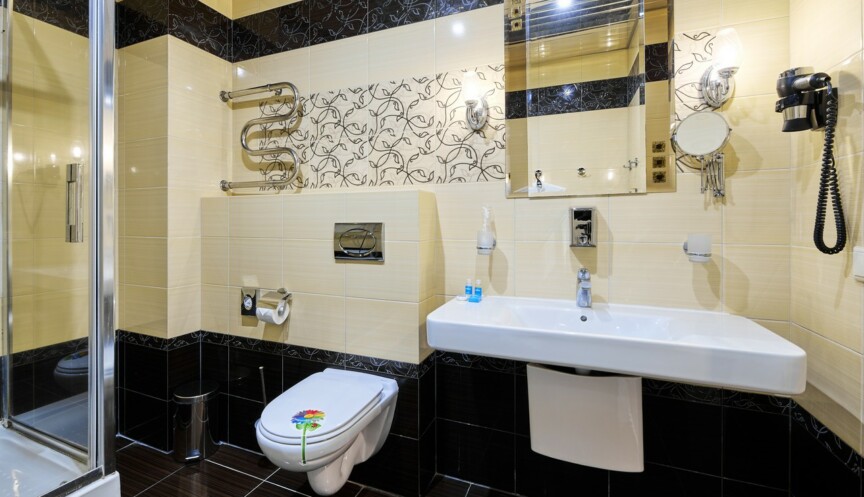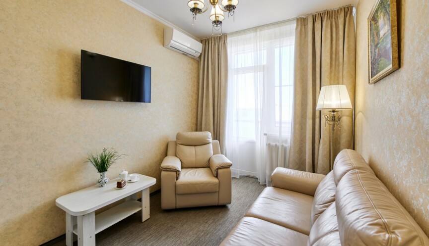 В номере: удобная двуспальная кровать, ванная комната с феном и набором гигиенических и косметических средств, халат, балкон, ТВ, бесплатный Wi-Fi, телефон, холодильник, чайник, набор посуды, утюг и гладильная доска, удобный диван, шкаф-купе в прихожей, туалетный столик, шторы с полным затемнением комнаты, кондиционер.