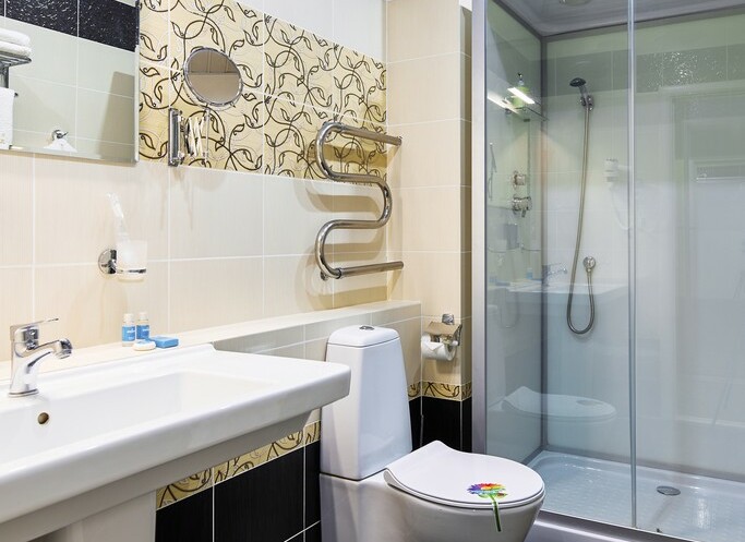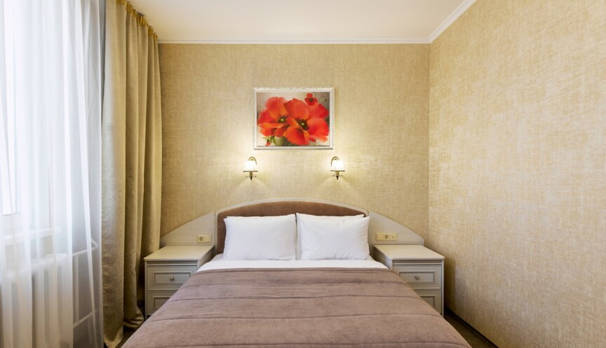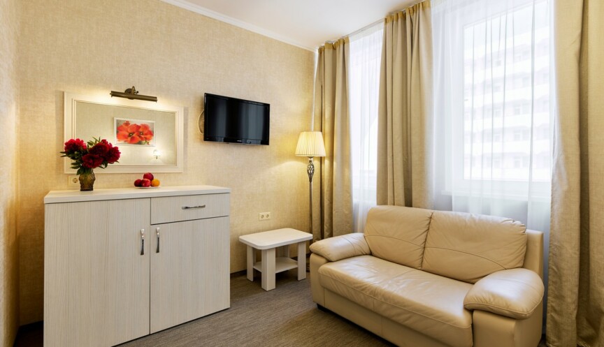 В номере: душ, умывальник, туалет, ТВ, холодильник, фен, утюг, чайник, гладильная доска. телефон, набор посуды/ 2-х спальная кровать, шторы с полным затемнением комнаты, шкаф-купе в прихожей, туалетный столик, стол-тумба.