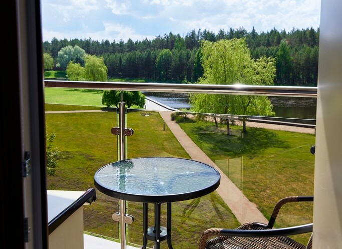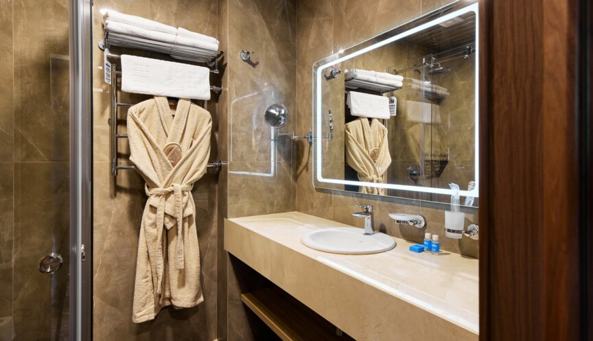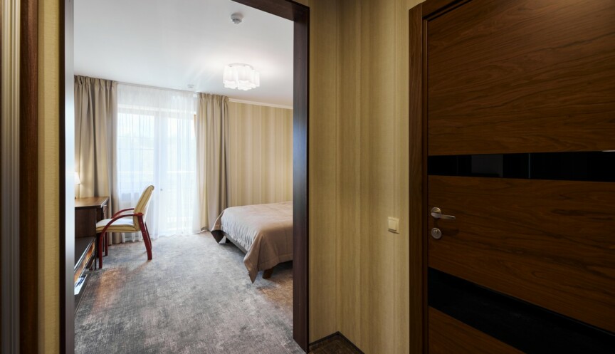 В номере: удобная двуспальная кровать размером 160*200 см., ванная комната с феном и набором гигиенических и косметических средств, халат, балкон, ТВ, бесплатный Wi-Fi, кондиционер, телефон, холодильник, чайник, набор посуды, утюг и гладильная доска,  шкаф-купе в прихожей, туалетный столик, шторы с полным затемнением комнаты.