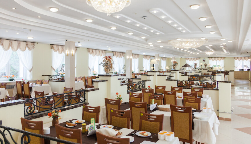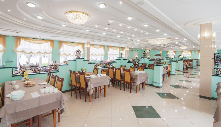 Столовая, с двумя прекрасными залами (малахитовым и янтарным) на 500 посадочных мест, расположена в главном корпусе санатория. В санатории организовано пятиразовое питание в одну смену, а для больных сахарным диабетом и лиц, нуждающихся в частом и дробном питании, предлагается дополнительный завтрак в 11:00 часов.